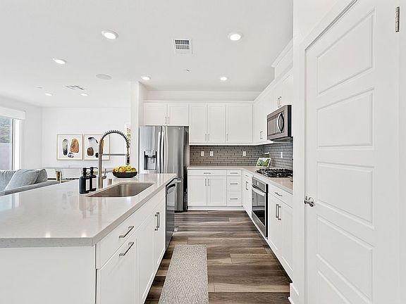 Gorgeous single story home with leased solar available in the wonderful community of Riverside! This home is a joy of detail and care; upon entering the home you are directed right into a wonderful layout that is accented with Armstrong no-wax vinyl flooring throughout, Interior pull down shades, shiplapped built in T.V. wall unit and a 5 speaker surround sound audio system built in the ceiling.The kitchen offers beautiful shaker style cabinets with lower pull out shelves for pots and pans, built in trash/recycle bins, quartz countertops, stainless steel appliances including built-in gas stove top and oven with touchscreen. All bedrooms are spacious with the master bedroom being a homeowners retreat with his and hers closet system. The master bathroom offers double vanity sinks, a separate tub and shower. Moving outside you will find a giant backyard with gravel landscape with custom concrete stepping pads, drought tolerant plants, fruit trees, pergola with a seating area and a large fire pit area with more seating. Home also includes a concrete pad which is set up for wiring for a sauna and spa. This home won't last long, so make it yours!