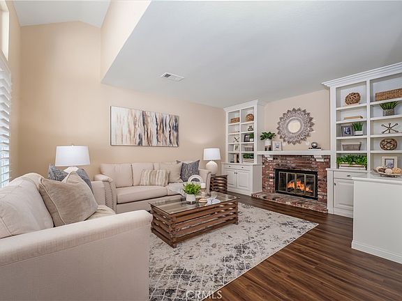 Do not wait for open house, come see this one today. Exceptionally well located single family detached house in of the most sought after areas in town. Tastefully remodeled and upgraded and perfectly oriented on a peaceful interior lot backing up to a grassy greenbelt. Three generous sized bedrooms upstairs with 2.5 total bathrooms. 2 car garage plus 2 car driveway, inside laundry room. Kitchen has been remodeled with wood cabinetry with soft close features, quartz product slab counters with full backsplash, stainless steel appliances including gas range, dishwasher and microwave. Wood floor throughout the main level. Large living room with vaulted ceiling, gas/wood burning fireplace and built-ins. Formal dining room plus breakfast nook and breakfast counter. Family room opens to the kitchen and yard. Primary bedroom features a large balcony, walk-in closet, vaulted ceiling and remodeled bath with dual sink vanity and tiled walk-in shower. Hall bath has been upgraded with a jetted tub with tile shower surround. Dual pane vinyl frame windows and sliders, plantation shutters and repiped with PEX. Central heat and air conditioning. Wrap around yard with plenty of patio space, faux grass and gated courtyard entry. Walk around the corner to resort style amenities, Serrano Highlands pool, spa, tennis courts, Pickleball courts, basketball court and clubhouse as well as Tamarisk Park and Peachwood Park with baseball field, basketball, picnic areas and tot lot. Low property tax rate, NO Mello Roos and desirable schools.
