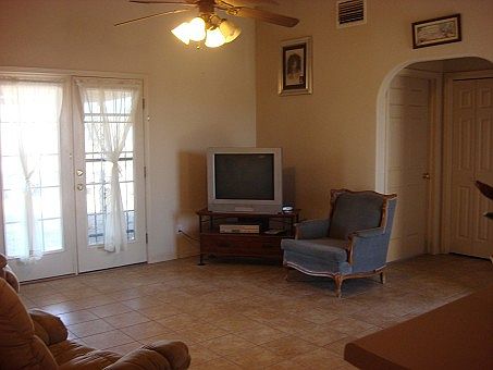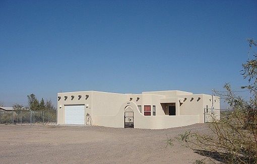Desert living within city line. This 2 bedroom, 2 bath pueblo style home features all tile floors, large eat-in kitchen, open living room with pot shelves and French doors to patio. Master suite w/walk-in closet, shower and entrance to patio. Front courtyard and sits on .77 of an acre. Near the Country Club.