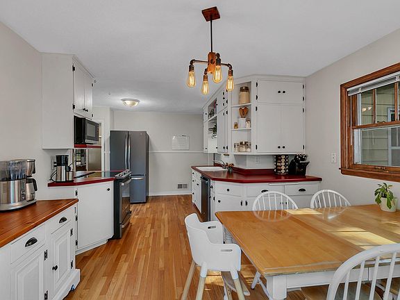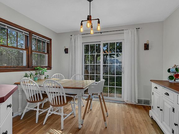 Charming, well cared for 4BR/2BA/2CAR home with spacious living room, two main floor bedrooms, full bath, large eat in kitchen with new stainless steel appliances. Hardwood floors throughout main floor. Upstairs you will find an expansive bedroom with multiple closets and attic for storage. On the lower level, the fourth bedroom/home office is adjacent to the family room, a large gathering space which features a beautiful stone, gas fireplace. Large storage room in addition to the essential 1/2 bath and laundry room where the sand point well is housed. Private, fenced, park like backyard with expansive patios, raised beds, perennial gardens, fire pit and darling playhouse. Oversized garage with new service door to backyard and breezeway to the house. New roof, new furnace, new garage door opener newer washer and dryer.
