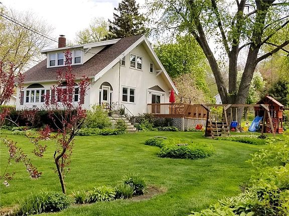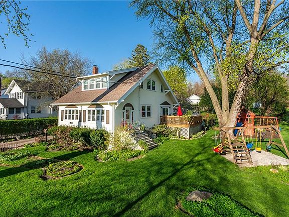 A gardener's paradise with nearly an acre in town! Welcome to this charming 1.5 story w/over 1900 sqft finished in pristine condition! Step inside to original woodwork, newer carpeting over HW floors, high ceilings and wainscotting maintain the character of the home. A front sunroom with huge arched windows opens to a huge living room with built ins, woodburning fireplace, dining room w/original built in buffet. Updated kitchen includes all appliances and nice counter tops! Pretty stairway leads up to the master suite and all bedrooms have walk in closets to keep everything organized. Main BA updated, yet retained the original flooring. LL offers a 3/4 bath & laundry w/washer & dryer included. Nearly all windows replaced! The yard is immense with numerous unique perennials, bushes, shrubs & trees that attract hummingbirds and butterflies. A beautiful enclosed courtyard and nice deck with sliders to enjoy all this nature + gas hook up for your grill. 2 playsets stay and 2+ car garage!