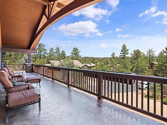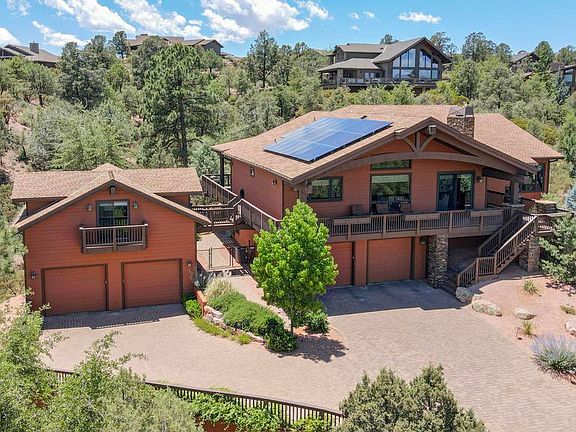 Experience the pride of ownership in this stunning home located in the prestigious Chaparral Pines Golf Community, boasting numerous upgrades and exceptional features. Enjoy breathtaking mountain views from various vantage points within the home, and ample garage space with an attached 2-car garage and a detached 2-car garage/heated workshop, totaling 1,330+/- sq ft. The unique separate guest quarters, called the 'tree house' by the sellers, comes complete with a kitchenette, private bathroom, and a private deck overlooking the Mogollon Rim and mountain range. Energy-efficient living is ensured with owned solar panels and the convenience of an elevator. The spacious interior offers 3,130+/- sq ft under roof, featuring three bedrooms, an office, and main level living, with an inviting entryway and wood flooring. The large, open-concept family room and kitchen includes eat-in dining, a breakfast bar, pantry, recessed lighting, stainless steel appliances, a wood-burning stove with rock accents, and floor-to-ceiling 'Sierra Pacific' wood-clad windows. There are new Smart shades in the Great room, kitchen, Primary bath, and TV Room. The spacious main level primary suite features a gas fireplace, walk-in shower, private water closet, jetted tub, and a generous walk-in closet. Additionally, there are two guest rooms, one with an ensuite, and an office with built-ins and a safe. The lower level offers flexible space, with an additional room currently used as an office or potential hobby room/bedroom, a half bathroom, and access to a covered patio and hot tub. The detached guest quarters provide 605+/- sq ft with a kitchenette, private bathroom, and a private deck offering spectacular mountain views. Outdoor living is enhanced with wrap-around Trex decks, covered and uncovered patios, a hot tub, Smart irrigation system (Rachio), all within a meticulously landscaped front and back yard that is fully fenced for pets. Practical upgrades include a paver driveway, newer grinder pump, two whole house 'quiet' fans for fresh evening air, surge protection for the entire home, and R60 insulation in both the guest quarters and main home roofs, ensuring extra low utilities with fully paid solar. Sellers have home offices and request a minimum of 1-hour notice to schedule showings. A required membership must be purchased at close of escrow, with a minimum Trailhead Membership for a one-time fee of $7,500.00 plus monthly dues. Don't miss this gem showcasing pride of ownership and luxurious living in Chaparral Pines.