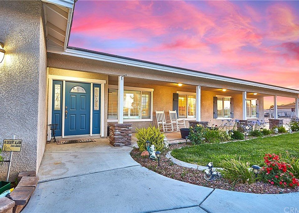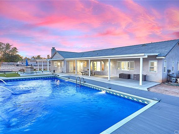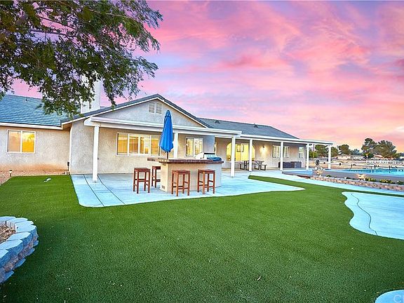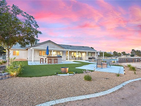 Remarkable Skyline Ranch Pool Home with 2 master suites! This gorgeous Apple Valley home sits on 1 acre with landscaped front and back yards. Enjoy the manicured front lawn under a well lit front covered porch. Upon entering, you are greeted by spacious formal living and dining areas. The formal dining room has arched windows and luxury vinyl plank flooring. The home was recently built in 2010 and the large eat-in kitchen has beautifully upgraded cabinetry, island, all stainless steel appliances including 5 burner natural gas cooktop and an electric double oven. The kitchen opens up to a massive great room with dual ceiling fans, plantation shutters, wood burning fireplace with mantle and ledger rock surround. This home boasts a split floor plan with a total of 5 bedrooms plus an extra room for an office/craft room/game room. The main master suite has dual ceiling fans, the master bathroom has granite countertops, tile shower and tub surround with 2 walk-in closets. The back has 2 covered large patios, a built in BBQ island, fire pit and a 16x32 Secard pool with deck. With the lot size, the finished 4 car garage with engineered 10x8 storage area in the rafters (designed during construction of the home), a 24x24 saloon style storage shed with 1" sturdy floor capable of holding automobiles, RV gate and slab for RV parking, there is plenty of space to store your toys here! Call your agent to view this home today. This is Apple Valley living at its' finest!