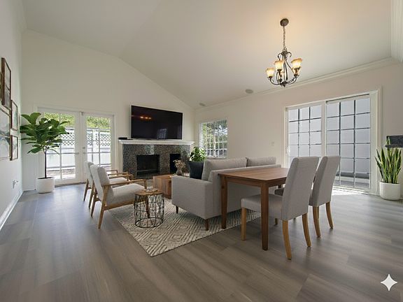 The centerpiece of the home is the expansive great room with vaulted ceilings and crown molding, bathing the space in natural light. It also features brand new Stone Plastic Composite flooring and a cozy gas fireplace with a granite surround. The great room's French doors open to a private, wrap-around backyard, creating a seamless connection for indoor-outdoor relaxation or entertaining.