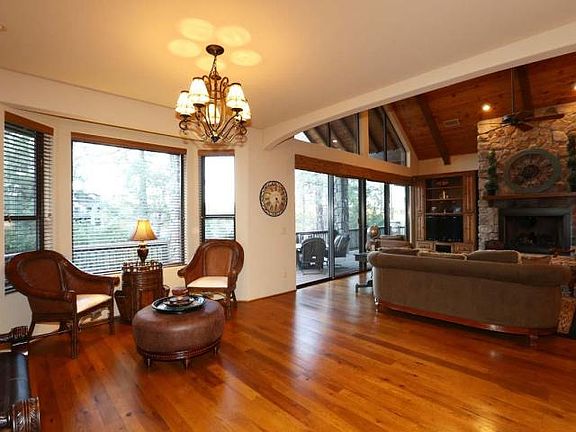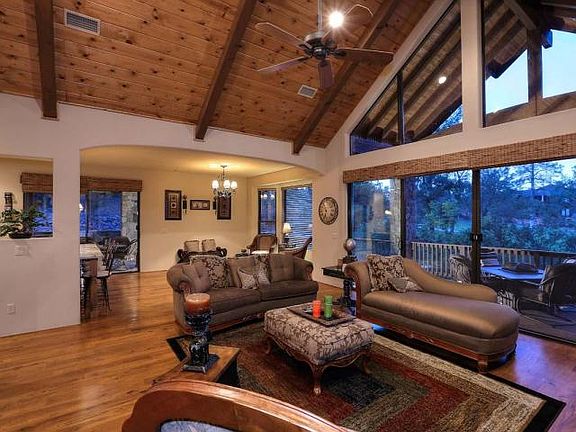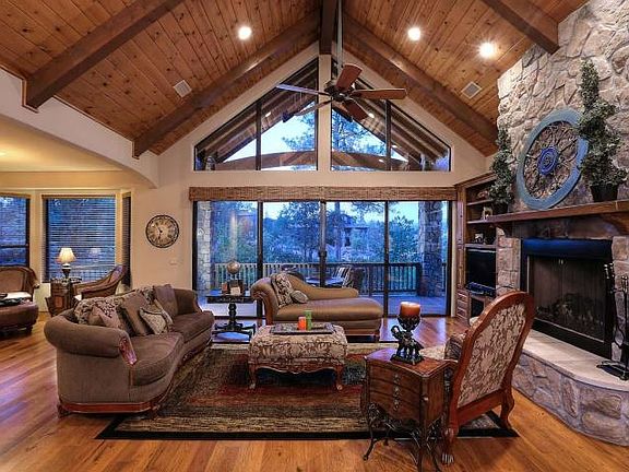 CUSTOM BUILT HOME THAT SHOWS LIKE NEW. 3 BEDROOMS, 3 BATH, OVERSIZED 2 CAR GARAGE. FOYER ENTRY THAT OPENS TO A STUNNING GREAT ROOM W/ VAULTED WOOD BEAM TONGUE AND GROVE ACCENTED CEILINGS THAT OPENS TO EXPANSIVE VIEWS. STONE GAS FIREPLACE & CUSTOM BUILT-IN CABINETS, HARDWOOD FLOORING, STAINLESS STEEL APPLIANCES, BUILT-IN WINE COOLER, 6 BURNER GAS COOKTOP, CENTER ISLAND, KITCHENETTE AND DINING AREA, LAUNDRY ROOM WITH SINK AND PLENTY OF CABINETS, WALK-IN PANTRY, LARGE MASTER SUITE WITH A GAS FIREPLACE, DOUBLE GRANITE SINKS, OVERSIZED JETTED TUB, DOUBLE HEAD TRAVERTINE SHOWER, BIDET AND A 1/2 BATH ON THE MAIN LEVEL WITH NO STEPS. DOWNSTAIRS OFFERS 2 BEDROOMS, FULL BATHROOM, WINE ROOM, WET BAR, STORAGE, FAMILY ROOM AND ACCESS TO THE COVERED SLATE PATIO. THE COVERED DECK ON THE MAIN LIVING AREA OFFERS VIEWS OF THE RIM AND THE 12TH FAIRWAY. OFF THE KITCHEN AREA THERE IS AN ADDITIONAL COVERED PATIO W/ A SEPARATE OUTSIDE DINING AREA. THE GARAGE HAS BEEN FINISHED WITH EPOXY FLOORING AND SLATE BASEBOARDS. ALL FURNISHINGS & DECORATIONS INSIDE AND OUT ARE INCLUDED IN THE PURCHASE PRICE. BUYER TO PURCHASE MEMBERSHIP OF THEIR CHOICE.
