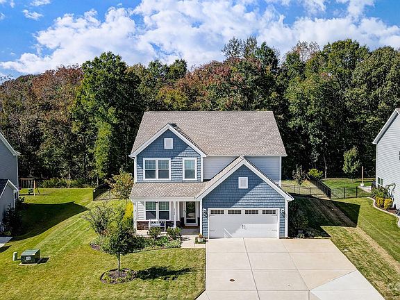 Welcome to this immaculate and contemporary 4-year-old two-story home that offers the perfect blend of comfort, style, and convenience. This delightful property has four spacious bedrooms and two and a half bathrooms, kitchen with granite counters and stainless appliances, a great room with a gas fireplace, creating a perfect setting for cozy evenings. The den is perfect for working from home. A two-car garage with added depth is great for extra storage with overhead built in compartments for totes and boxes.. A full front porch exudes classic charm, creating an ideal spot for morning coffee or neighborly chats. The backyard is a true haven, backing up to a serene wooded area, providing a natural and private backdrop with a fenced in yard. Enjoy outdoor living at its finest with a covered porch, extended patio, and a cozy firepit area. Perfect for gatherings and relaxation. Seller is offering $5000 credit for buyer's closing cost or to help buy down their rate with acceptable offer.