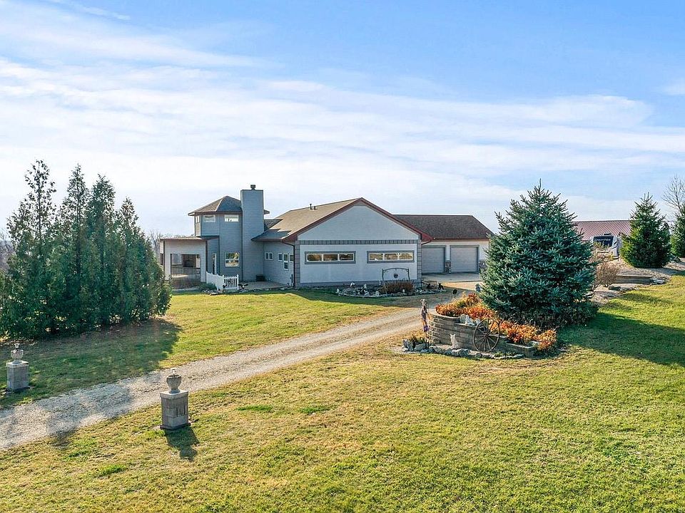Bring your animals & your farming dreams! Minutes from the state line area & 45 minutes to Madison. 4141 sq. ft. home on 35.05 acres zoned for AG use. 56x40 metal pole building & a 26x28 2 car attached garage. Main floor laundry, open floor plan w/ soaring ceilings & stone fireplace. Huge kitchen & dining w/ stainless appliances & solid surface counters. 17X16 master bedroom has a walk-in closet, private bath w/ jetted tub & walk-in shower. 1600 sq ft walkout lower level has 3rd bedroom, half bath, plenty of open finished living area + lots of unfinished space. Enjoy panoramic country views from the 577 sq. ft. wrap around covered porch. New furnace 12/22. 30 amp line in shop for charging campers, etc. The tillable land rents for $5,000. annually from May to harvest.