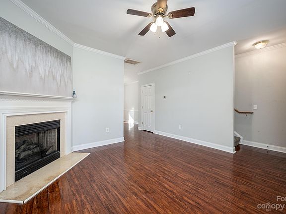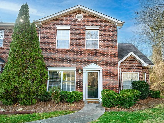 Enjoy living in a gated community convenient to UNC-Charlotte as well as several parks/greenways! This end-unit brick townhome has a primary suite on the main level with a walk-in closet and bath with dual-sink vanity, plus 2 additional bedrooms upstairs with ample closet space and a shared bath. The living room features a gas log fireplace with TV niche above and there is a coat closet near the tiled entry. The well-equipped kitchen includes a smooth-top range, built-in microwave, refrigerator, dishwasher, and stainless sink with disposal. There is a powder room for guests on the main level as well as a spacious laundry room. Washer and dryer convey, as do all kitchen appliances! In addition to pull-down attic stairs, there is a huge, floored, walk-in attic for storage galore or future expansion! Sliding glass doors from the dining room (as well as a back door from the laundry) lead to a covered patio with ceiling fan where you can relax and enjoy wooded views of your back lawn.
