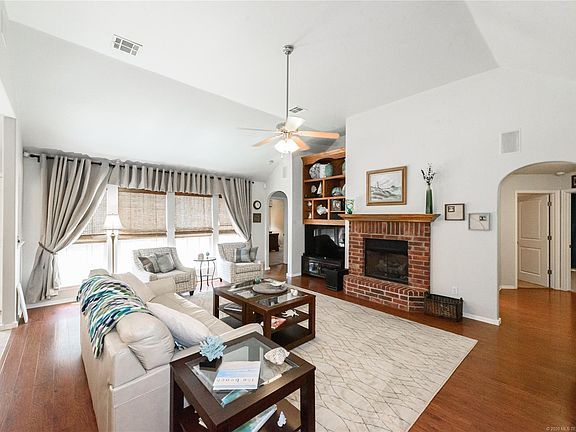 Charming traditional brick home on corner lot in Jenks school district. True 4 bedroom, office/formal dining room, 2 bath, and 2 car garage in quiet cul de sac. Open kitchen/living room floor plan with vaulted ceilings provides a great place to entertain. Living room has wall of windows to bring sunshine in! Both bathrooms has double sinks however, master bathroom has separate vanities. Professionally landscaped with full fenced backyard. Neighborhood features park, basketball court, and splash pad.