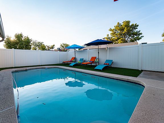 Welcome to The Good Vibes Home in sunny Chandler, AZ. Featuring four beautiful bedrooms, including two king rooms with comfy mattresses and crisp sheets, this home is perfect for making lasting memories. The master suite boasts an en-suite and direct access to the heated pool. Enjoy family BBQs, shuffleboard competitions, or cozy dinners in a fully stocked space with all the essentials, including a Keurig. Conveniently located in the East Valley, this is your ideal vacation spot. This home is dog-friendly. A total of one dog will be welcome for a $25 per night pet fee, or for those guests staying 30 nights, the pet fee is reduced to $10 per night. The pool is equipped with a heat pump, reel, and cover. Pool heating is optional, and the cost for pool heat is $70.20 per day. Should the home be equipped with a spa or hot tub, the cost to heat the spa or hot tub is included in the rental amount year-round. Occupancy limits and quiet hours from 9pm to 8am are strictly enforced. Violation of any noise ordinances will be subject to fines that can reach up to $10,000 per violation. Events or parties are not allowed without prior written approval and an additional fee. Any unauthorized parties or events will be shut down and a fine will be assessed. This is a smoke-free property. Violation of the no-smoking policy will result in a $300 smoking fee and liability for any fire or property damage costs. Air conditioning cannot go below 70 degrees as this freezes out the units and causes issues.