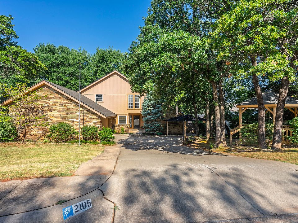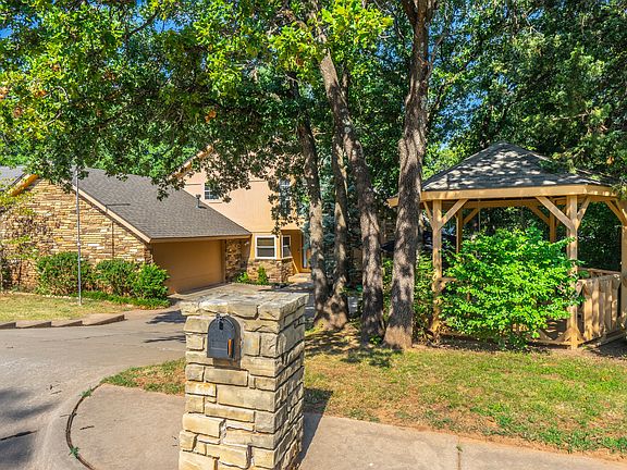 Fabulous home in much desired Southeast Edmond! NEW ROOF 2019!!! Tucked away in the trees with awesome covered deck....hooks in place to hang a hammock and swing! 2-car garage with 8-10 person storm shelter! Extra bonus....covered parking for that 3rd car to be protected from hail/sun. Updated tile flooring, neutral paint and fresh carpet upstairs! This home is move-in ready!!! Master bedroom on first floor w/walk-in closet and full bath w/shower, 2 sinks & granite. Enclosed patio just off master with steam sauna! Kitchen w/double convection ovens, granite island, pot rack, breakfast bar, plenty of cabinets & built-in desk. Formal dining with vaulted ceiling. Living room with wood burning fireplace, bookcase and fan. 2nd living w/bay window, cathedral ceiling & fan. 3 large bedrooms, 1 full bath and living area upstairs. Utility room w/ironing board. This home is immaculate and well maintained! Open floorplan!
