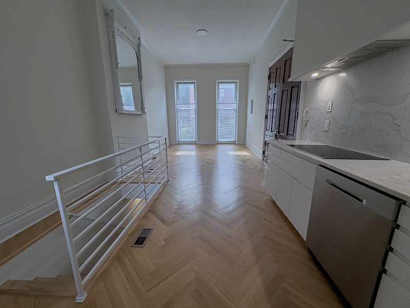 - Brownstone bones: high ceilings, herringbone hardwood floors, oversized, south-facing front windows overlook Green Street through a raised garden, filling the space with natural light