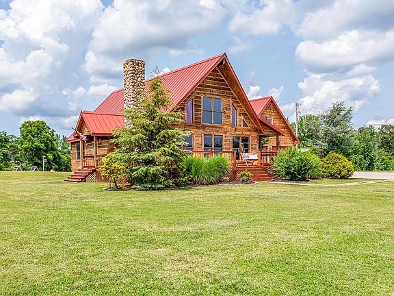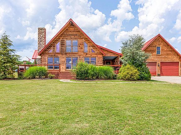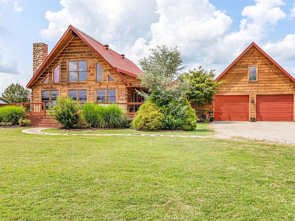 Rustic elegance!! This is a cypress log home that is sure to WOW!! Interior features an open concept floor plan with soaring vaulted ceiling, windows, windows and more windows, kitchen with pine cabinetry and newer stainless appliances, gas log fireplace for those cozy nights, gorgeous stairway with loft above overlooking the living area and an option of a primary bedroom suite upstairs or downstairs. The exterior of this home features 4 acres and a perfect garden spot plus an oversized 30x30 garage/shop with 9' garage doors and a stairway leading to storage above or an area to "finish out". However your favorite outdoor feature will be the wrap around porch overlooking the precious fully stocked pond w/ducks. Let the long driveway lead you up to this property to view ... you have to see it ... to believe it!