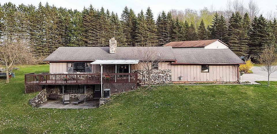 Located close to town on a private road with circle drive overlooking beautiful Helmer Lake. This home has 10.57 acres with 500 ft. of waterfront property, with a fishing dock. Large 32X48 ft. pole barn and a 2 car attached garage. This home has 5 bedrooms with the possibility of a sixth, a large first floor laundry. Some of the features include: newly updated floors throughout the spacious kitchen and upstairs bathrooms, double sided gas fire place, a large deck overlooking the lake, a finished basement with a walk out patio and master on suite. This is the ultimate family "gathering" home with space and storage galore. Enjoy the beautifully landscaped yard and fire pit when you host your family gatherings.