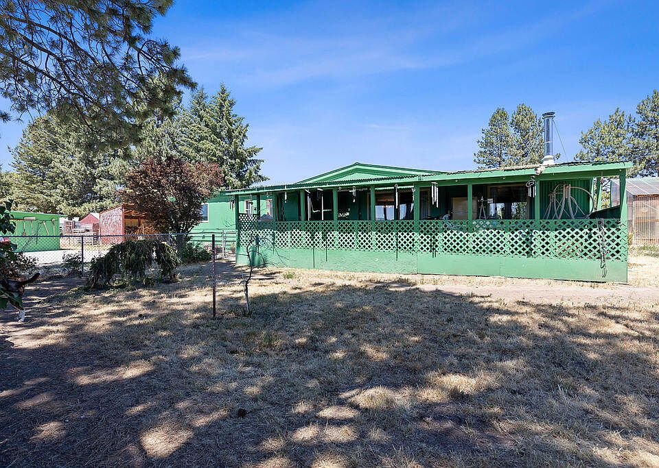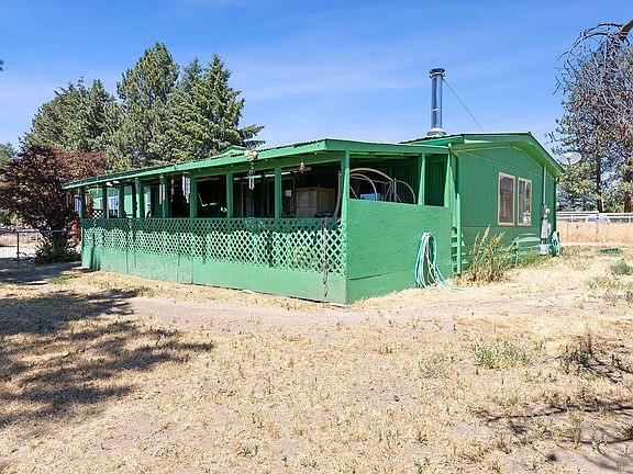 Private and serene manufactured home on 2.12 acres with irrigation rights. This 3 bed, 2 bath, 1876 sqft retro home is a DIYer's dream! The open living space with its own built in bar makes the home perfect for entertaining friends and family. Kick back & cozy up to the warm wood stove in the winters and relax in the summer with air conditioning throughout! The primary suite is spacious and the bathroom is equipped with a shower and a soaking tub along with an extra closet for storage. Kitchen has a large island w/ cooktop, spacious countertops and plenty of cabinets for storage. The property is perfect for a small farm. There are multiple outbuildings, for hobbies and storing your toys! The property also has a large woodshed, fenced garden area, greenhouse, fenced yard and pasture. Call your favorite Realtor and book a showing!