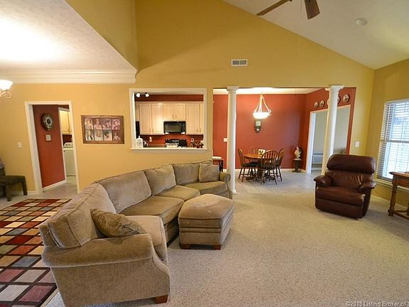Open Floor Plan Patio Home, convenient location for easy travel to all of Kentuckiana area. Upon entering the carpet/tile foyer, you enter the expansive great room with dining room area, corner gas fireplace & visually open to eat-in kitchen, sun room with lots of light & cathedral ceiling and screened in patio. The Master is to the back of the patio home and has 2 closets (1 walk-in), walk-in double shower, double vanity and water closet. The 2nd bedroom & bath are to the front of the home offering a split bedroom concept. A small backyard is off of screened porch.
