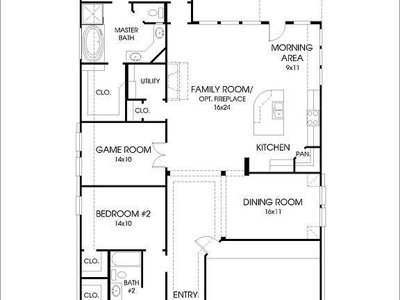 Entry with 11-foot coffered ceiling. Extended entry with ceramic tile floor. Kitchen and adjoining morning area open to the family room with ceramic tile floor. Kitchen features island with built-in seating space. Formal dining room. Game room with French doors. Secluded master suite includes double vanities, garden tub, separate glass-enclosed shower and a walk-in closet in the master bath. Extended covered backyard patio. Two-car garage.