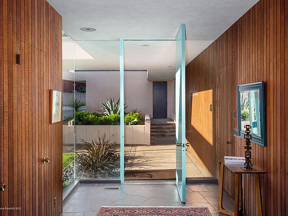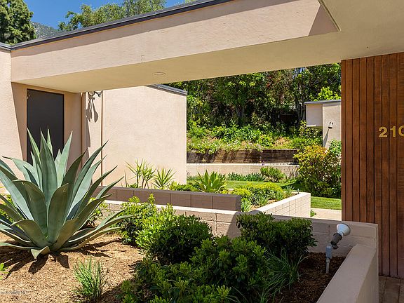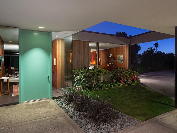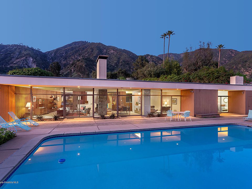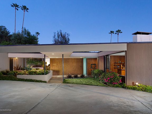 Mid-Century John Galbraith Architectural Gem, with long horizontal roof lines, deep fascia and planters forming an impressive pergola entry into an interior of well-preserved quality vintage features throughout. Rough-sawn redwood paneling, 9' walls of glass and deft open plan, provide an integration of indoors and outdoors, and a sense of grandeur for formal entertaining as well as casual living. Handsome redwood-enclosed entry with its black slate floors conceals a powder rm, closets and bartop, and leads to a dramatic view thru living spaces to the outdoors. A double Bouquet Canyon stone clad fireplace links living and dining spaces and includes well-crafted buffet & cocktail bar. The central kitchen, lined in mahogany cabinetry, stainless double ovens and counter bar, provides striking diagonal views of living and dining area and landscaped backyard. Oversized bedrooms, generous closets, spacious bathrooms and laundry room complete the plan. Surrounding the home is an expansive pool & patio, backyard grass area, extended motor/sports area & upper level orchard. A 501 sqft. workshop & office, next to the garage provides potential for many uses. Located in gated enclave of estate sized lots w/spectacular views & privacy, yet close to city amenities.