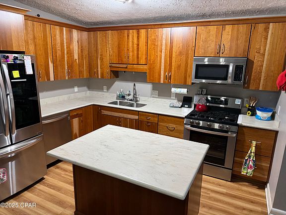 CURRENTLY UNDER CONTRACT, SELLER WILL CONSIDER BACKUP OFFERS This fully renovated residence in Forest Park/Central Panama City is sure to impress. The home underwent extensive renovations in 2019. The kitchen features a functional layout with an open floor plan, new cabinetry finished in two-toned cherry wood, Corian countertops, and an island providing additional workspace and storage. The LG stainless steel appliances include a French-style refrigerator with freezer at the bottom and a glass door for easy access, a gas range, built-in microwave, dishwasher, and disposal. The home boasts vinyl plank flooring throughout, new windows, and was repainted inside and out. The roof was replaced in 2018. The bathroom has been completely redesigned with custom tile shower, glass doors, a new vanity, and shelving for linens and extra storage. A pocket door enhances space efficiency.