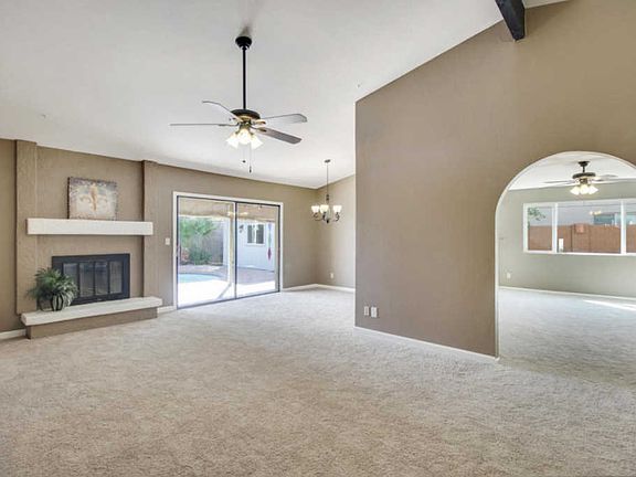 IDEAL STARTER HOME in FANTASTIC LOCATION! One mile from 101 & close to US60 freeway. CHARMING & inviting atmosphere draws you to this 3bed/2bath move-in ready home. Great family & living rm w/a fireplace that is sure to keep you cozy! New neutral paint & carpet. Ceiling fans throughout. Lovely kitchen area features granite counter tops & large window looking out to a fun tropical oasis backyard. Master bedroom includes built-in vanity w/sink. Covered patio leads to DIVING-POOL that was resurfaced & re-tiled in 2016. Freshly painted deck. Two new double-pane windows.Backyard houses one storage shed & one pool rm/man-cave with A/C! Desert landscape in front & back makes for easy maintenance! RV gate. NO HOA!