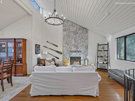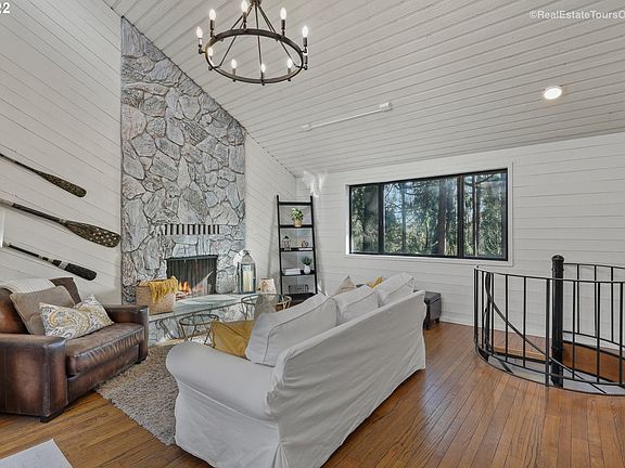 Accepted Offer with Contingencies. Updated & Private NW Contemporary nestled amongst tranquil trees. Breathtaking river view atop the cul-de-sac. Open flow, lodge style family room w stone fireplace, captivating cedar walls & large windows for natural light. Stylish paint colors. Spiral staircase to 2nd fireplace, slider & storage. Remodeled baths. Loft overlooks kitchen & living w 3rd fireplace. Tiered back deck w hot tub. Walk to Mary S Young Park. Top rated schools!