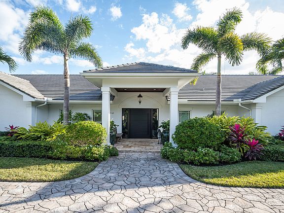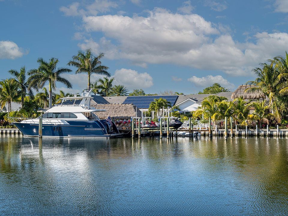 This IS a boater's dream! Over 184 feet of PROTECTED DEEP-WATER frontage, a 98' Ipe wood dock, 24,000 LB lift, & quick access to the intracoastal! Recent renovations transformed this 5,500+ SF home into a modern, luxurious retreat that seamlessly blends indoor & outdoor living. Privacy is enhanced by lush landscaping & authentic Chickee Tiki huts, creating multiple areas for entertaining or enjoying the Florida lifestyle. Spacious updated floor plan with a gourmet kitchen, spacious room sizes & private en-suite bedrooms. All impact glass sliders & windows! Nothing has been missed here!