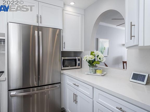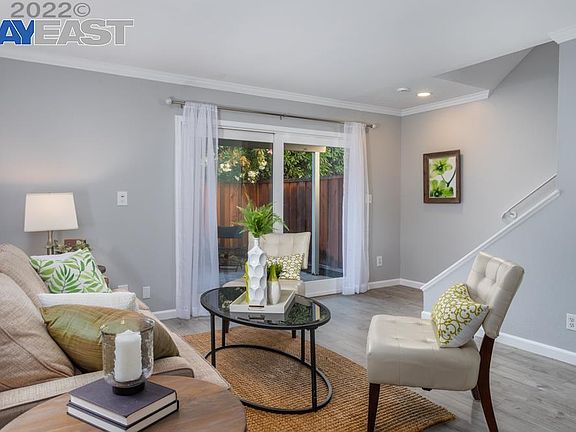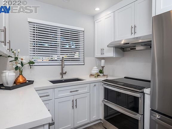 Wonderful end unit, townhouse style! 2 large bedrooms, 1.5 bath, nearly 1100 sq. Completely remodeled kitchen with stainless steel appliances and quartz slab countertops. Totally updated and remodeled bathrooms. Gleaming new flooring, washer and dryer, NEST, window coverings, and freshly painted. Large private backyard patio, 2 designated parking spaces. Great location and reasonable HOA that includes water, trash, landscaping and exterior maintenance. Walking distance to marketplace, BART, shopping, restaurants. Minutes from Lake Chabot, and freeways 238/580/880.