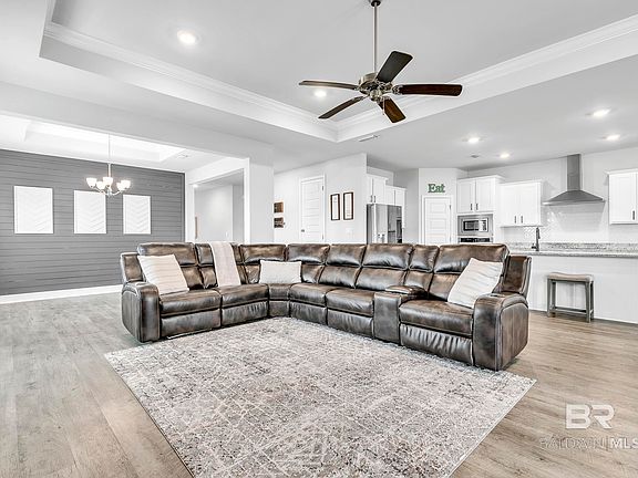 Welcome to this stunning Gold Fortified 4-bedroom, 3.5-bath home with a three-car garage, located on a spacious corner lot in the Fairhope Falls community—just a short walk to one of the neighborhood pools and with no Fairhope single tax. This home features luxury vinyl plank flooring throughout and granite countertops in both the kitchen and bathrooms. The gourmet kitchen is equipped with stainless steel appliances, a built-in microwave and oven, a large island, and a custom herringbone tile backsplash. It opens seamlessly to a spacious living room and a formal dining room with a custom accent wall, making it perfect for entertaining. A convenient half bath is located off the main living area for guests.The spacious primary suite offers a relaxing retreat, featuring a custom accent wall, a large walk-in closet, dual vanities, a soaking tub, separate shower, and a private water closet. Bedrooms 2 and 3 are located at the front of the home and share a Jack & Jill bathroom. Bedroom 2 also includes a custom accent wall, adding a unique touch to the space.Bedroom 4 connects to a large bonus room with a mini bar (sink + mini fridge), a private full bath, and a walk-in closet—perfect for guests, teens, or extended family. This versatile bonus space can also serve as a man cave, media room, home office, or playroom.Additional highlights include a three-car garage with a heated and cooled office space, whole-home gutters, a screened-in back porch, and a fully fenced, flat backyard, along with a separately fenced area ideal for pets.Fairhope Falls offers two pools, a playground, a fishing pond, kayak access to Fish River, and scenic hiking and biking trails along the river. This home is also ideally located near several local points of interest. It’s just a short drive to Downtown Fairhope, known for boutique shops, local dining, and shopping. Buyer to verify all information during due diligence.