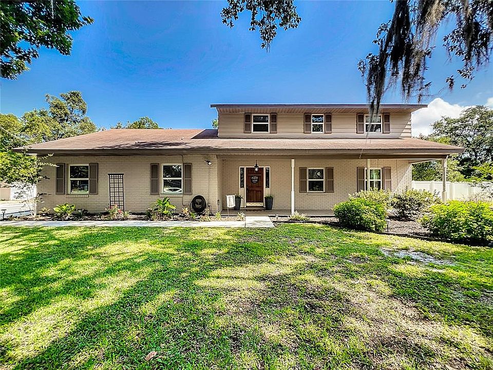 Welcome to your dream home retreat! Nestled on just under an acre of sprawling land adorned with majestic mature trees, this 5-bedroom POOL HOME with NO HOA offers not only ample living space but also a sanctuary for your beloved toys. As you drive up the expansive driveway, envision your trucks, boat, or RV comfortably parked on your property, all within easy reach. For those with a passion for tinkering or in need of ample storage, indulge in the luxury of a sprawling 24' x 48' detached air-conditioned garage workshop, complete with a convenient half bath and storage loft, perfectly complementing the attached garage. Step inside to discover a realm of modern elegance. The recently updated kitchen adorned with granite counters and newer wood cabinets beckon the culinary enthusiast, while a spacious laundry room stands ready for all your household needs. Hosting gatherings is a delight in the colossal dining room, where brick flooring adds warmth and charm. Need a sanctuary to conquer tasks? A private office awaits on the first level, offering the perfect blend of privacy and productivity. With 5 bedrooms, including a sprawling loft space above the garage, possibilities abound. Transform it into a family room, game room, or craft haven—the choice is yours. The primary suite, with its en-suite bath, offers a tranquil retreat after a long day. Outside, the sparkling pool beckons with its enchanting waterfall effect and privacy fencing for moments of uninterrupted bliss. Entertain guests or simply bask in the serenity of your surroundings from the comfort of your large screened-in lanai. Conveniently located near Polk Parkway giving you access to I-4, major retail, local theme parks and attractions, major metro areas, and local beaches in minutes. This home promises the perfect blend of seclusion and accessibility. Don't let this opportunity slip away – schedule your private showing today and make this paradise yours before it's too late.