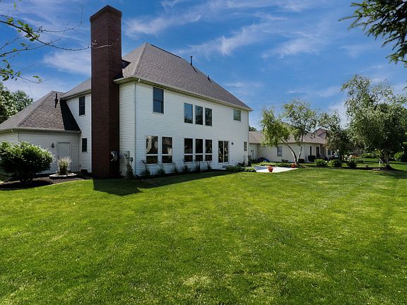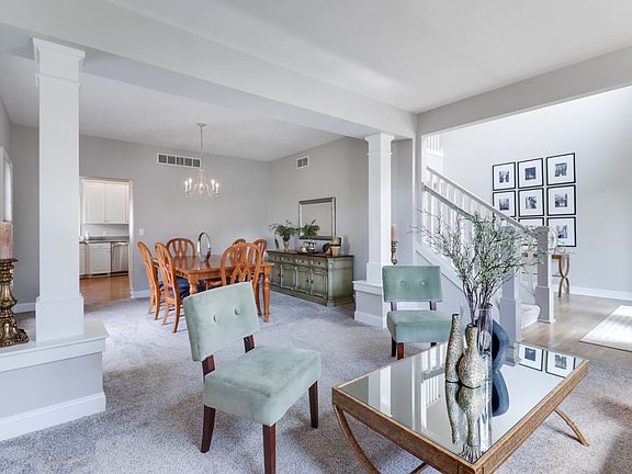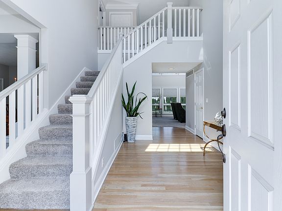 Beautiful home in Summerfield subdivision! This is what you've been waiting for! The moment you enter into this home you will feel welcome! Two-story grand foyer with warm wood floors and impressive staircase! Peaceful, neutral colors throughout the house and an abundance of natural light everywhere! Two-story family room with wood burning, gas starter fireplace opens into eat in kitchen. Fresh white cabinets in the lovely kitchen with wood floors, stainless steel appliances, island with seating overhang, gas stove, coffee bar area, and corner sink with sweet window view of the backyard. Generous sized living room and dining room with lovely architectural pillars! Bright and cheerful, first floor laundry room with tall cabinets for storage, hanging space and utility sink. Luxurious primary bedroom with tray ceiling and en suite with double sinks, tiled shower, whirlpool tub, enclosed toilet, and spacious walk-in closet! Follow the open balcony to the opposite side of the home where there are three large bedrooms that share a full bathroom with double sinks. Grab the popcorn and your favorite drink and head to the basement media room to watch a fun movie with people you love spending time with. You will also love the extra workout room with fresh NEW carpet and mirrors! There is a walk-in storage closet to help keep things organized and more storage area in the mechanical room! Peaceful backyard with NEW concrete patio, fire pit and plenty of space to create your dream oasis! Meticulously kept large three car garage with back door to easily access the yard. Many updates to this well cared for home. Roof 2018, NEW 2024 water heater, NEW 2024 patio, NEW 2024 sidewalk, NEW 2024 landscape refresh, NEW 2024 basement carpet throughout. Location is convenient to schools, shopping, medical facilities, parks and Constitution Trail.