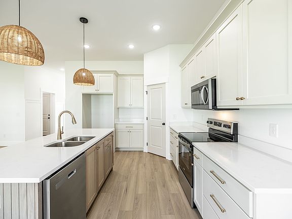 Beautiful lvp flooringDesigner finishes throughoutStainless french door fridgeWood shelving throughoutWood blinds throughout