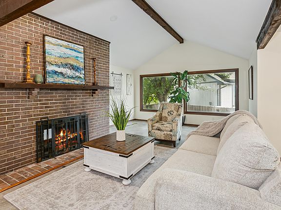 There's a vaulted living room that showcases beamed ceilings, wood floors and a two-way fireplace, while the family room features a wet bar, brick fireplace and a slider leading to a multi-level deck.
