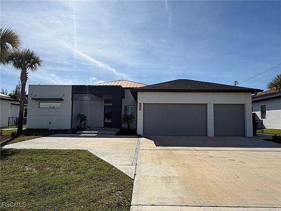 Southern Exposure, Newer Built Salt Water Pool Home! ASSUMABLE VA MORTGAGE AT 5.75% - Available to Veterans! Welcome to this stunning modern home in the up and coming and highly sought-after Pine Island Corridor. This exquisite residence features 3 spacious bedrooms and 2.5 well-appointed bathrooms, offering floating cabinets, quartz counters and high end fixtures. Pull into the oversized concrete driveway with a decorative transition, leading to a 3-car epoxy floor garage, plus additional parking pad. Inside, the home is designed with sophisticated touches such as straight stacked porcelain tile throughout, impressive 12 ft ceilings, and elegant brass Sputnik chandeliers, impact windows and doors throughout. The open space kitchen is a chef's dream, featuring a 12 ft quartz countertop island and backsplash, European-style cabinets with soft-close technology, 2 Whirlpool stainless steel ovens and a commercial grade hood vent. The living area includes a wine case feature wall with an art niche and an electric fireplace, creating a cozy and stylish atmosphere. One way solar tinted sliding glass doors lead to the oversized pool area, perfect for outdoor entertaining ensuring privacy as well as energy efficiency. Cool off in the electric heated crystal blue blue salt water pool with sun shelf surrounded by a fenced-in backyard beautifully landscaped with an assortment of pygmy dates and palm trees. Additional outdoor amenities include oversized pavered sun pad, outdoor shower and a summer kitchen with a grill, refrigerator, and sink. Smart home features such as a Google entry, security system, along with LED lighting throughout, add to the modern conveniences of this home. Contemporary touches such as a decorative wine display, plantation shutters, remote controlled custom zebra blinds, built in custom closets and floating cabinets make this home is a perfect retreat for those who appreciate modern luxury and enjoy the Florida lifestyle. Head down to the Pine Island Corridor for a plethora of dining, shopping and entertainment options. City Water and Sewer in Place! You deserve to enjoy everything SWFL has to offer - beautiful weather year-round, world class fishing, golfing, kayaking, paddle boarding, tubing, jet ski or just relax in your very own tropical paradise! Call and schedule a private viewing today! NOT located in an HOA!