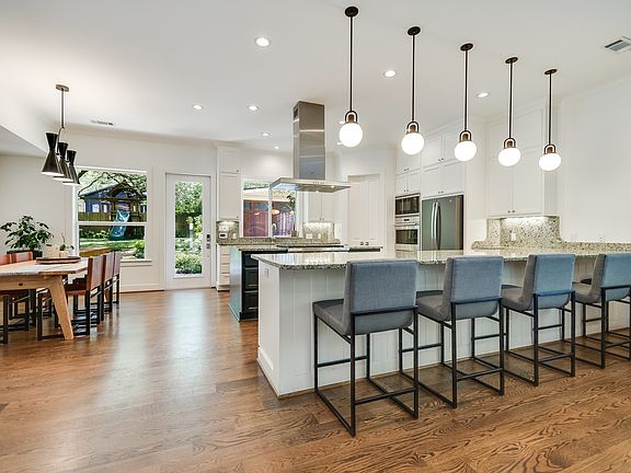 Seated on a lush tree-covered lot in the heart of Tarrytown, this charming 6-bedroom home offers a quiet retreat from the bustle of city life. Completely remodeled in 2014, a sleek open-floor plan creates a seamless flow on the first floor, with abundant natural light illuminating a clean, bright interior complemented by gorgeous hardwood. A gourmet kitchen with a beautiful granite island features chef's grade stainless steel appliances and a sweeping breakfast bar. Three downstairs bedrooms with built-in shelving can double as offices or playrooms, while the primary bedroom and additional bedroom sit upstairs. Unwind in the spacious primary bedroom with a luxurious attached bath that features an oversized glass shower with dueling shower heads and a rain shower. Lounge on the open wood patio with raised garden bed while children play on the private playground in the spacious fenced backyard with custom sandpit. A gated driveway leads to a detached two-car garage in the backyard. Enjoy a quick walk down to Mozart's for coffee on Lake Austin, or bike down to the neighborhood parks and hiking trails less than a mile away.