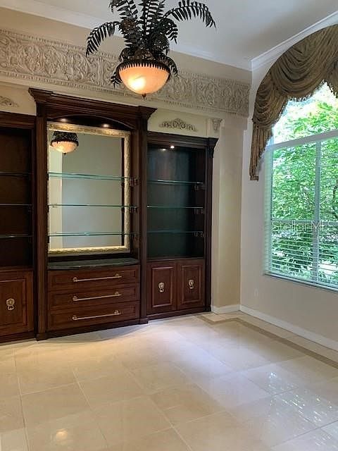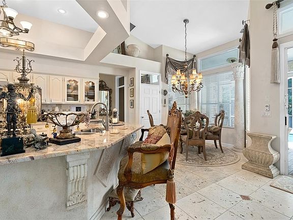 Discover Old World Charm around every corner in this breathtaking home minutes from downtown Windermere! You'll enjoy extensive upgrades inside and out in this immaculately renovated and maintained 4-bedroom, 3-bath home. A hand-forged custom security gate greets you at the front door leading into a high-arched foyer and the main living area. The first thing you'll notice are stunning travertine floors, inlaid mosaics, and tumbled stone accents throughout (professionally restored to museum quality in 2022.) Enter your personal bar or office to the right featuring a full wall of built-in thick-glass shelving, drawers, handmade corbels, antique hardware and a gorgeous chandelier. This room is beautifully accented with custom panels from the Street of Dreams home owned by Dwight Howard. The elegant formal dining room includes an arched entry, exquisite chandelier, custom chair rails and panel inserts, and a built-in wine rack and storage cabinet. Solid travertine columns frame the perfect place for your favorite art on a wall with a professional Venetian finish and recessed lighting. The open concept main living room, kitchen and breakfast room feature vaulted ceilings and are appointed with custom travertine columns that beautifully accent the flooring and designer granite countertops in the kitchen. The primary bedroom has an ensuite bathroom that boasts dual vanities, beautiful travertine flooring, custom lighting, and an extra-large marble shower in the private water closet. Access the lanai and sparkling pool with spa from the master suite or main living area. Here you'll find tumbled stone flooring with a mosaic rug accent, large solid travertine columns, three ceiling fans, and a summer kitchen for easy outdoor entertaining. From the lanai, enter your personal botanical garden with 6 separate patios, winding stone walkways, beautiful mature gardens, yard lighting throughout, and a gorgeous custom pergola. The backyard offers supreme privacy and is fully fenced with locking gates for your security. Ask for the extensive list of additional upgrades done to this home, including but not limited to, a new roof in 2018, new heat/air conditioning, new high pressure toilets, new carpet/ premium padding and paint in all bedrooms, trash compactor, instant hot water at sink in kitchen, new faucets, new vanities, custom lighting throughout, etc... 2022-09-28