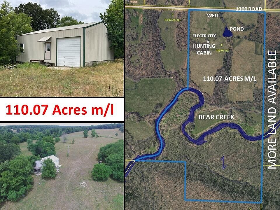110.07 ACRES m/l with year-round Bear Creek running through the Property! Throw in a Hunting Cabin, Pond, Well, and Electricity in the Stockton School District and you have found a Slice of Heaven in the Ozarks! The land is gently rolling with a perfect mix of pasture for livestock and woods for wildlife! If you are looking for a place to build, there are multiple building spots with beautiful views. If you are looking for a weekend or hunting season get-a-way property, it is perfect for that also with the 30 x 37 hunting cabin, well and electricity already on site. Buy it now and bring your buddies for deer season! Take a good look at the aerial photo and you will truly appreciate what a great find this property is! Only minutes to Stockton Lake. Call Today!