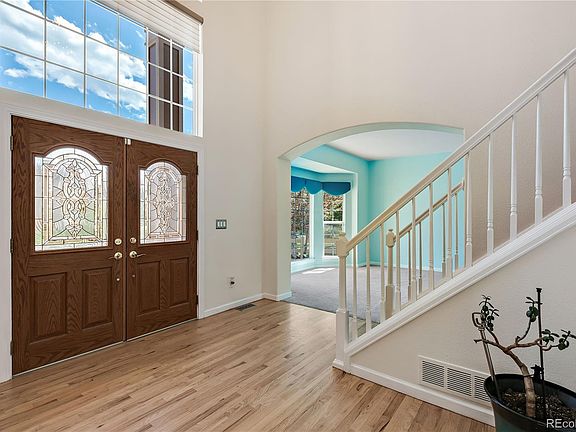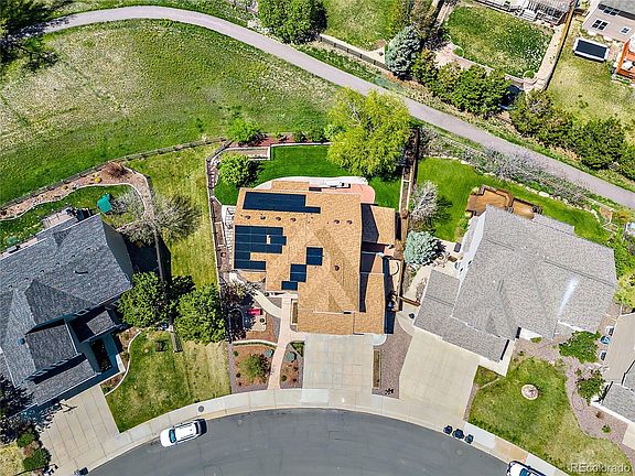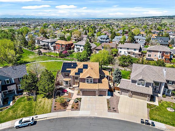Meticulously maintained by the original owners, this 2-story home boasts stunning curb appeal with its stamped concrete walkway, brick sitting area, xeriscaping, and covered stamped concrete porch. Enter through French doors into the foyer with refinished hardwood floors, double-height ceilings, and curved staircase. Family room features hardwood floors, gas fireplace, and wall of windows. Newly remodeled kitchen with marble tile floors, smart CAFÉ appliances, granite countertops, island, pantry, and elegant finishes. Formal dining & living rooms. Main level bedroom/office. Luxurious powder bathroom. Laundry room with utility sink, cabinetry, folding table, and access to 3-car garage. The upper level offers 4 bedrooms, including the Master Suite with stunning mountain views. Renovated 5-piece master bathroom with Jacuzzi tub, new shower stall, quartz countertops, and dual vessel sinks. Carpeted bedrooms, one with direct bathroom access & another with walk-in closet. Additional full bathroom with dual sinks & shower/tub combo. Fully-permitted, finished basement features game room, bar area, media room, gym/flex space, and bathroom/steam room. Game room is perfect for pool table & equipped with surround sound. Adjacent bar with granite top, cabinetry, and built-in A/V cubbies. Media room with surround sound and negotiable 70" TV. Bonus gym area with speakers. Steam room with marble tile, bench, therapy light, multiple shower heads, and dedicated vent. Backyard highlights include stamped concrete patio, outdoor fireplace, covered bar & grill, pergola with grapevine, and leveled yard with retaining wall and rod iron fend. Other backyard features include brick/stone raised beds, chemical-free yard care, and solar & wired lighting. Seller upgrades include seller-owned solar panels, garage EV charging station, storage shed, new class-4 roof, and new electrical panels. Full property description available in the Supplements Section.