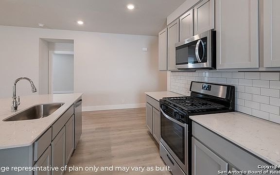 The Kingston is a single story home that offers 4 bedrooms, 2 bathrooms and 2,024 sq. ft. of living space. As you enter the inviting foyer, you'll pass three secondary bedrooms, as well as the secondary bathroom. You'll next enter the open concept kitchen which features stainless steel appliances, quartz countertops, and classic white subway tile backsplash. The oversized kitchen island offers a deep, single bowl sink and extra countertop space. The dining area flows into the living room, which has plenty of natural lighting and leads to a large covered back patio. The private main bedroom suite is located off the living room and features double vanity sinks, a huge walk-in closet and large walk-in shower with white subway tile surround. Additional features include natural gas, Mohawk RevWood flooring at entry, downstairs, halls, living room, kitchen, and dining/breakfast area, tile in all bathrooms and utility room, pre-plumb for water softener loop, faux wood window blinds, and full yard landscaping and irrigation. The Kingston includes our HOME IS CONNECTED Smart Home base package which includes an Amazon Dot, Front Doorbell Camera, Front Door Deadbolt Lock, Home Hub, Light Switch, and Thermostat.