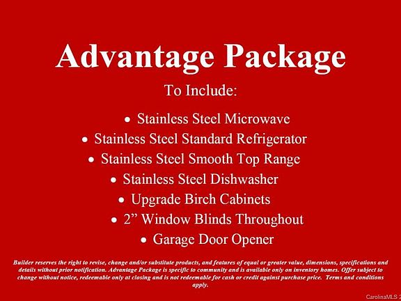 Builder is offering buyer promotion of All Closing Cost/Pre-paids paid plus our ADVANTAGE PACKAGE (Stainless appliances including Std. Fridge, Microwave, Smooth Top Range, DW, Garage Door Opener, 2" Blinds, an Birch Cabinets) To qualify for promotion and BONUS, contract must be @ full price less buyer incentive and w/pref lender.