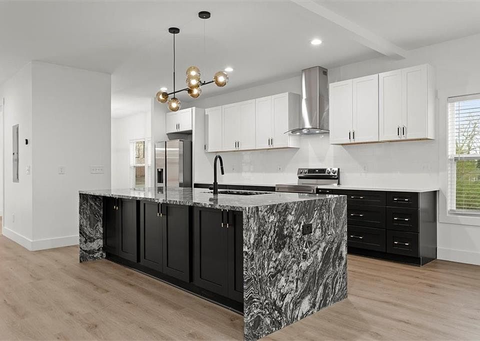 Boasting 2,100 carefully crafted square feet, 3 bedrooms and 2.5 baths - this modern masterpiece is ready for you to call it HOME! Enter a light-filled main floor, with separate formal dining + fluid kitchen and living spaces. The custom kitchen features eat-in breakfast area, full ss appliance package, and an oversized, double-wide island with the most beautiful waterfall-edged stone & plenty of seating! Enjoy a wine cellar & wet bar, perfect for entertaining! The spacious primary suite, 2 additional bedrooms and laundry room are all housed on the second floor.