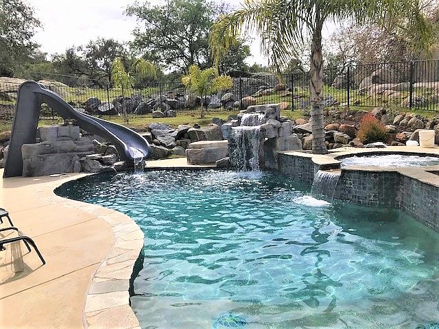 - Pool: Below Ground, Private, Heated, Solar Heat, Waterfall