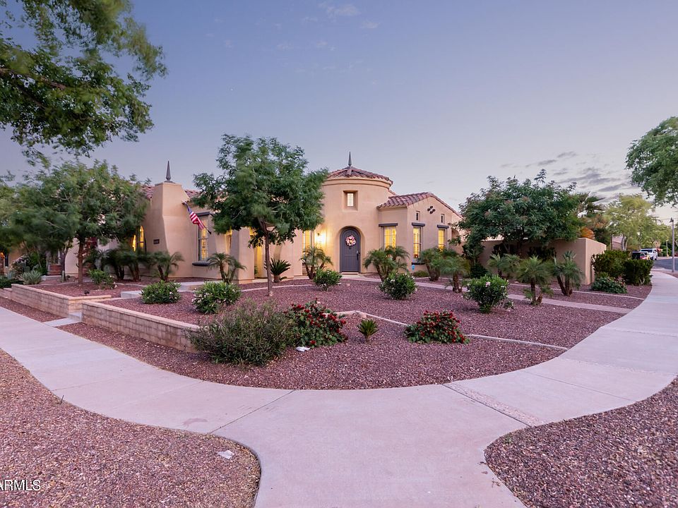 Welcome to Verrado where you have tree lined streets, over 21 miles of walking paths, 2 golf courses, 2 pools, a fitness center, and ''A'' rated schools. This meticulously maintained single level floorplan offers over 1700 SF with 2 bedrooms, plus a sitting room and 2 full bathrooms. Situated in the Main Street district of Verrado, this home is within walking distance to downtown Verrado. This home boasts an inviting foyer, archways, plantation shutters, wood flooring, and a formal dining room. This home features a beautiful living room, complete with a custom built-in cabinets as well as surround sound inside and outside. So many upgrades throughout this home! This gorgeous kitchen comes with gleaming SS appliances, granite counters, tile backsplash, desk area, recessed lighting, white cabinets with crown molding, a pantry, and an island with a breakfast bar. The primary retreat boasts a sitting room, outdoor access, a spotless ensuite with dual sinks, granite raised vanities, and a separate shower & tub. The resort-style backyard includes a covered patio, fire pit, and a stunning sparkling pool complete with a baja step and amazing water feature. Make your appointment today!