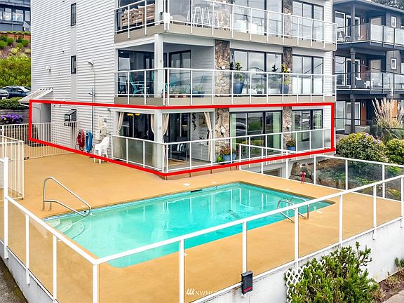 Highly desirable spacious Alki condo with gorgeous water views from all windows. Two bed two bath, updated and immaculately cared for... this home is move in ready. Luxurious upgrades! Crown molding throughout, travertine tile, bamboo flooring, gas continuous hot water heater, new gas fireplace, radiant heated floors and towel rail in primary bath. The entire ground floor is your new home, complete with the only lanai next to inground pool with absolutely amazing view of the boardwalk and the ever changing scenery of the Puget Sound. Steps away from the beach, local coffee shops, restaurants, and parks, this is a lifestyle of dreams come true! Alki Shores has a very strong HOA board that cares about the integrity of the buildings/property.