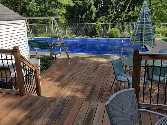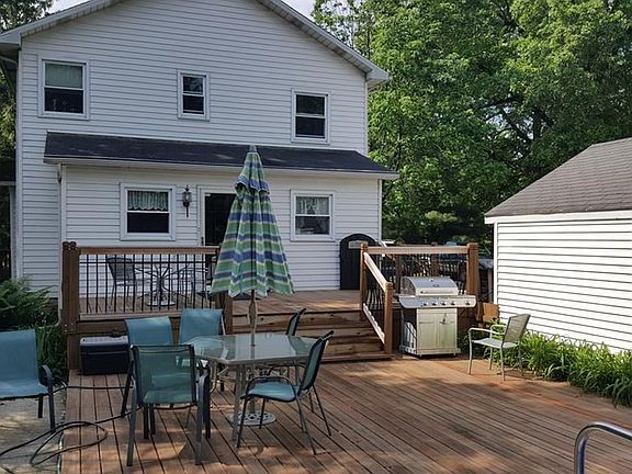 Private 5+ acres at the end of E. 37th Street. All window replacements. House is aluminum sided; 3-car garage is vinyl sided. Two gas forced air furnaces and 2 central air units - one for each floor. Updated electric - 3-100 amps. Large 2-level deck that leads to the pool area and pool house. Gutter cover on house and garage.