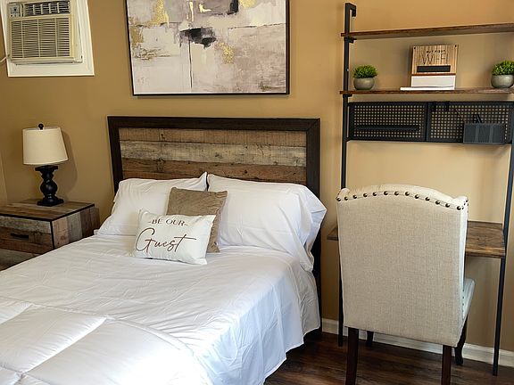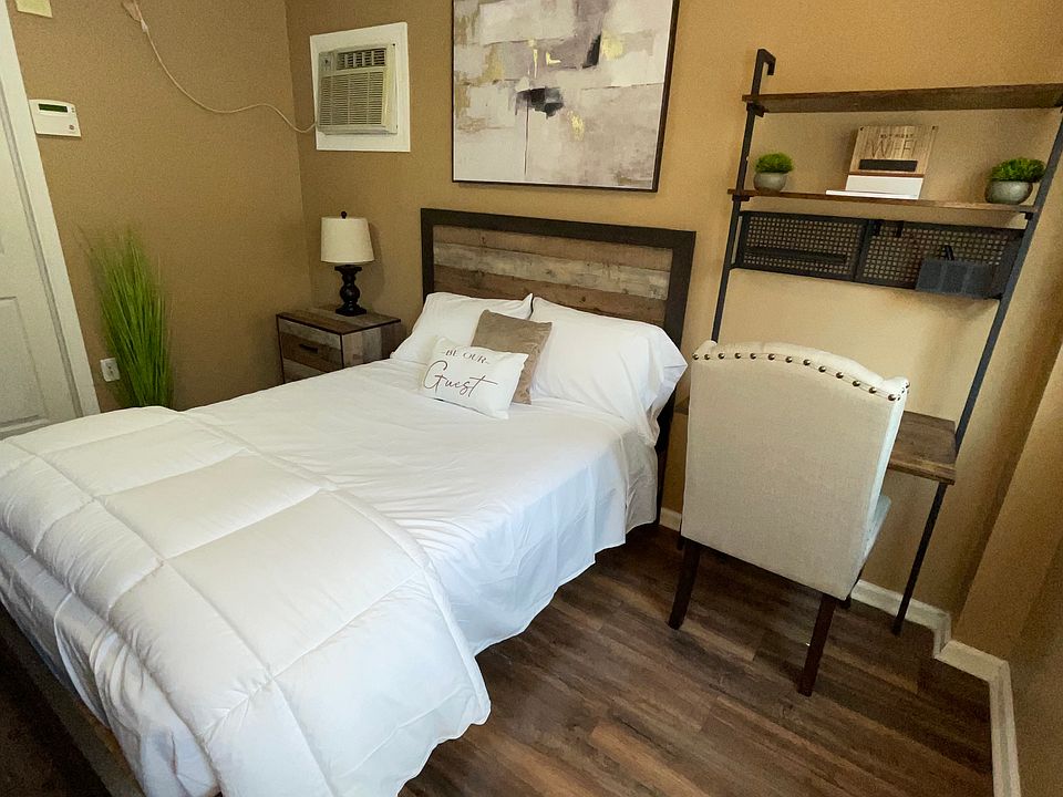 This stylish place to stay is perfect for Professionals looking for a quiet place with an area to work and unwind. This space consists of a double bed with a dedicated workstation/desk and comfortable chair. It comes equipped with a mini fridge, microwave and coffee bar station. The 52 inch TV with high speed internet and digital streaming capabilities will entertain without hesitation. This unit has a wall unit for all your heat and air needs and has a shared bath. You do not have access to the main house. The back yard has a hammock, lounge areas, shaded sitting areas, a fire pit and plenty of space for entertaining, relaxing or unwinding. Parking is provided on premises with a space dedicated for your room number. No Smoking No Vaping No Pets No overnight visitors Parking only in designated area for your room Quiet Hours: 10:30pm-7:00am