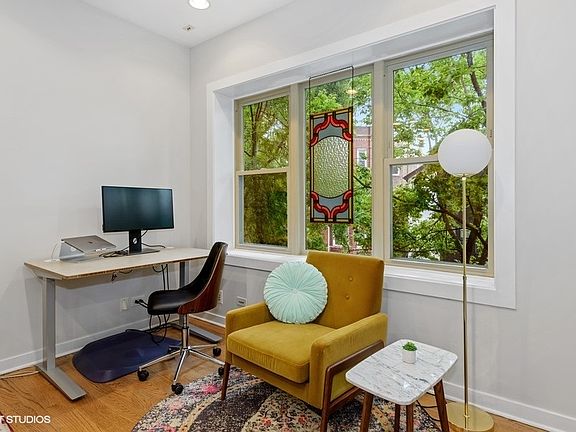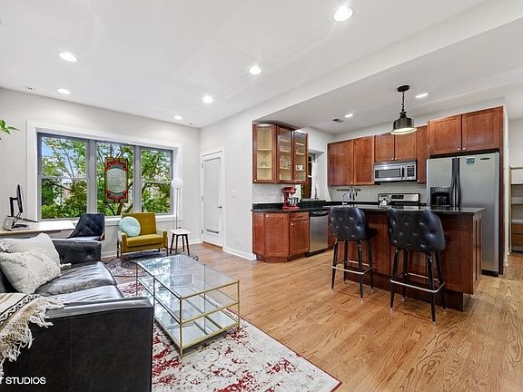 Logan Square gem! This two bedroom, two bath condo is located on a lovely tree lined street in the heart of one of Chicago's most sought after neighborhoods. Unit features hardwood floors throughout, a spacious living and dining area (currently used as a home office), Large, open concept kitchen with granite countertops, stainless steel appliances, and an island with breakfast bar. There's one large bedroom with en suite full bath and a second bedroom with French doors leading to one of two outdoor spaces. Spacious second full bath, in unit laundry, and a brick balcony overlooking the streetscape. The unit also has a very rare HUGE private storage unit right off of the rear balcony! Unit has been freshly painted and has updated lighting throughout. Brand new HVAC system, hot water heater, and garbage disposal in the fall of 2019. Healthy building, pet friendly, and just lovely. Building allows six rentals at a time and all six are currently rented.