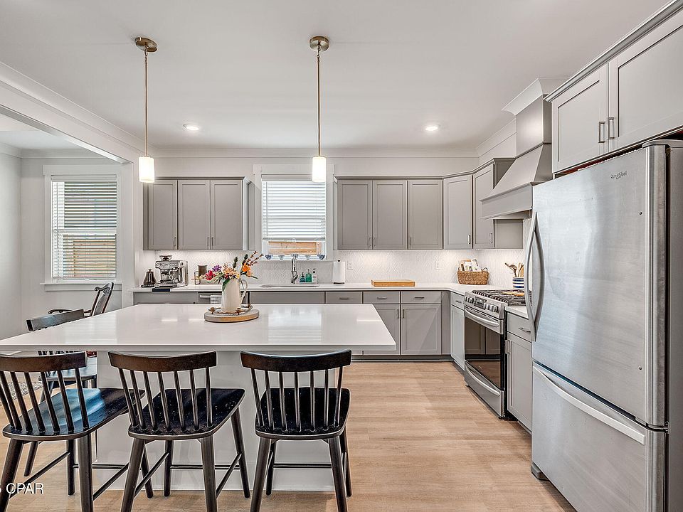 Inside, the flexible layout includes two living areas, ideal for a home office, dining room, or additional family space. Elegant coastal-inspired design elements include light walnut luxury vinyl plank (LVP) flooring, brushed nickel hardware, and stylish lighting fixtures. The home also includes custom blinds throughout and plantation shutters on the front windows to provide added privacy.
