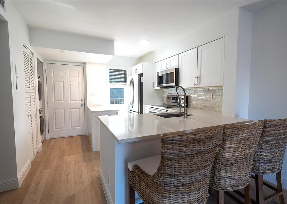 Stunning fully renovated 2/2 on the 2nd floor featuring a bright, modern interior and open layout. Enjoy new luxury vinyl flooring, fresh paint, impact windows, and upgraded lighting throughout. The remodeled kitchen showcases white shaker cabinetry, quartz counters, stainless-steel appliances, subway tile backsplash, and a peninsula with seating. Full-size washer/dryer included. Spacious primary bedroom with custom built-in walk-in closet and upgraded en-suite bath. Community amenities include elevator, clubhouse, heated pool, gym, tennis, playground, BBQ areas, and walking trails. Conveniently located near I-95, Harrah's, shops, dining, and beaches.