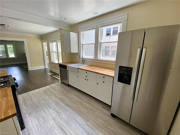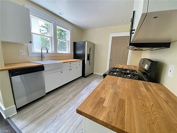 Beautifully renovated first floor unit in duplex on tree-lined Cleveland Heights street. This is a beauty! Nice and clean. New white kitchen with butcher block counters, farm sink, luxury vinyl tile flooring and new stainless appliances including dishwasher, gas range, and side/by/side refrigerator. New energy efficient systems including central ac. Washer and dryer in basement dedicated to this unit. Refinished hardwood flooring. Large front living room, sun room, dining room opens to galley kitchen. 2 bedrooms. Updated bathroom, linen closet in hallway. Garage parking. Close to the best of the Heights, Coventry district, restaurants, shops, library, coffee and more. Close to Case Western, University Hospitals and Cleveland Clinic.