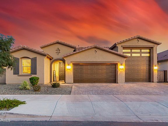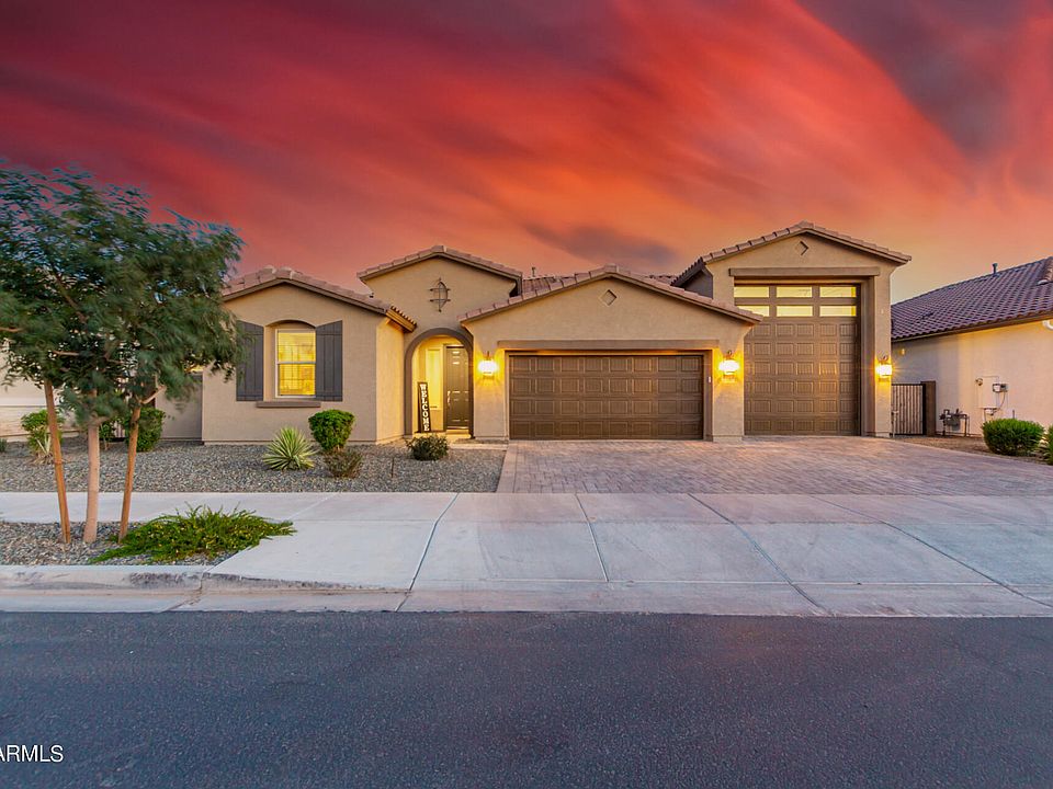 Spectacular 4-bedroom property with an RV garage is now available! You are greeted by an open layout where tile floors pave the way to an inviting great room with sliding doors, merging indoor and outdoor activities, making it an ideal spot for entertaining. To the side of this sprawling space is an open den, versatile to transform into a home office. Sleek kitchen is a haven for the home cook boasting an abundance of cabinetry, stunning quartz countertops, and state-of-the-art stainless-steel appliances, including wall ovens. A walk-in pantry provides ample storage, while the center island with a breakfast bar invites casual dining. The main bedroom features a relaxing sitting area, a private bathroom with dual sinks, an extended shower, and two walk-in closets. The 4th bedroom or club/game room is spacious, featuring a private bathroom and a welcoming sitting area. The property includes a 4 garage spaces, a standard 2-car garage and attached RV garage, providing an impressive amount of space for vehicles, toys, and storage needs. Outside, the backyard extends as an entertainer's paradise with its covered patio, seating areas, a warming fireplace, a rejuvenating spa, and a sparkling heated pool. The setting sun paints a beautiful canvas each evening, making this outdoor retreat the perfect space to unwind. It is not just a home but a lifestyle waiting to be lived! Book a tour now!
